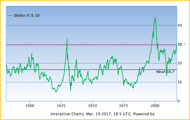 Um zu sehen, was Anleger in der Vergangenheit an Renditen verlangt haben, betrachten wir die historischen Kurs-Gewinn-Verhältnisse des S&P 500, jeweils berechnet mit den durchschnittlichen Gewinnen der letzten 10 Jahre an.