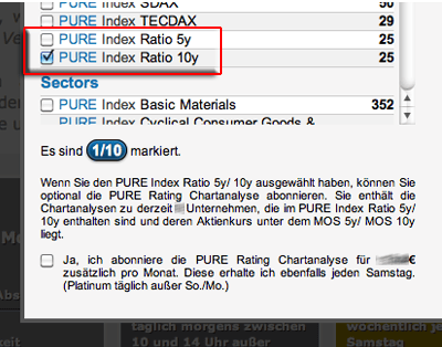 Unsere Chartanalysen werden im Gold und Platinum Paket angeboten und sind auswählbar, wenn Sie den PURE Index Ratio 5y und/ oder den PURE Index Ratio 10y im Abo auswählen.