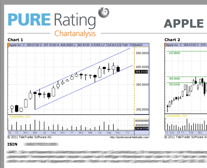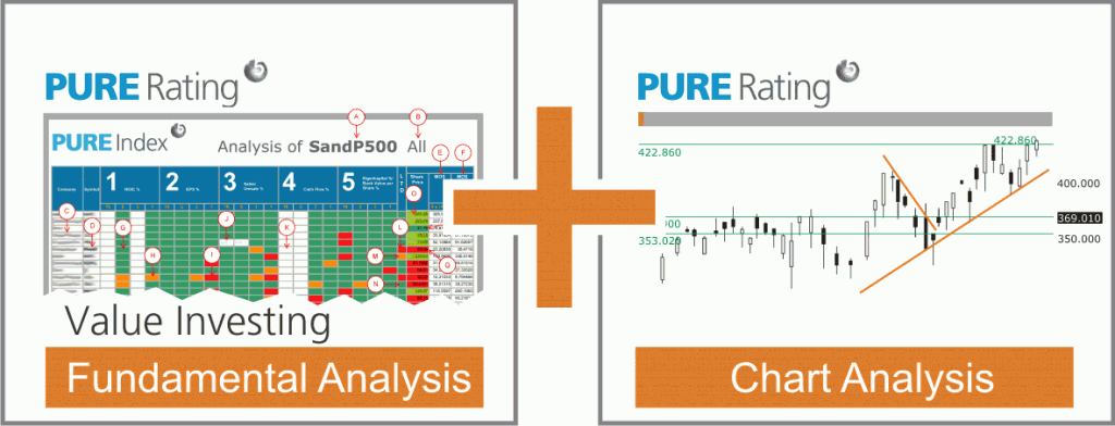 The products cover two large areas of financial analysis, fundamental analysis on the one hand, as depicted here by the PURE Index, which reflects the principles of value investing, and chart analysis as demonstrated here by the PURE Rating Chart Analysis.
